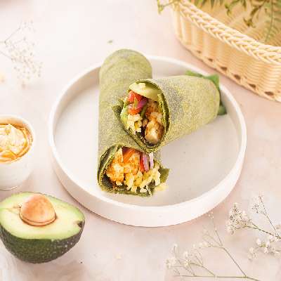 Whole Wheat Wrap, Mix Lettuce, Paneer Tikka, Avocado Onion, Tomato, Feta , Hummus, Mint Lemon Dressing .
